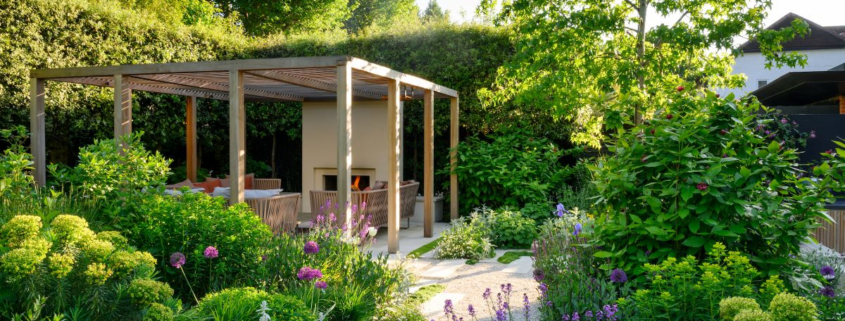 Tomoko’s redesign of the garden adds a softer, more natural character to both the side and rear spaces. English stone, clay pavers, and generous planting have replaced the former hardscape, while a once-forgotten side garden becomes a gravel parterre with multi-stem trees, woodland perennials, and raised kitchen beds. At the rear, buff stone and a timber arbour with a fireplace anchor the space, as lush planting beds draw greenery up to the house to infuse the terrace with new energy.